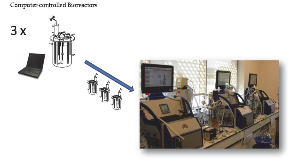 Vue générale de 3 fermenteurs formant l’outil de base ECSIM – Environmentally Controlled System for Intestinal Microbiota. Les appareils ont été développés avec la société Global Process Concept (www.gpcbio.com) et peuvent être utilisés individuellement ou collectivement sous forme de modules associés pour simuler en 3 étages, 3 différentes régions anatomiques du colon humain.