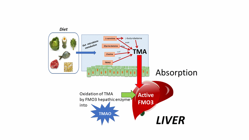 In the liver, TMA is converted into TMAO (TMA oxide) by human liver Flavine Monoxygenase 3 (FMO3 enzyme)