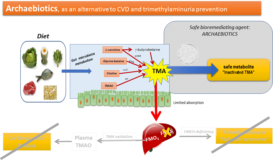 One of the most promising concept would be to convert TMA once it has been synthesised by gut microbes and before it is absorbed, which would avoid the question of diet / N-methyl compounds supply. Also, this would have impact on either FMO3 deficient subjects (less / no TMA in body fluids) and on level of pTMAO. There are no known natural bacterial metabolism (in anaerobia / without oxygen) / bacteria which can achieve this. However, some archaea, some naturally-occuring in the human gut, can convert TMA.