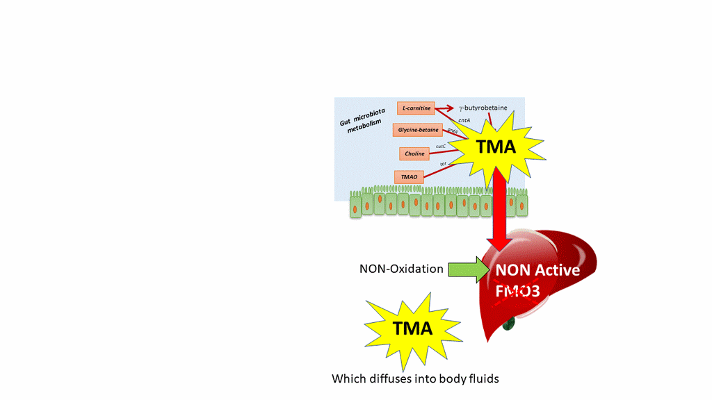 ....after having reached the liver, TMA is no more oxidized by FMO3, which is inactive. Therefore TMA diffuses into body fluids... and leads to TRIMETHYLAMINURIA (TMAU, TMA present in urine), a rare disease (either inborn or acquired disease).