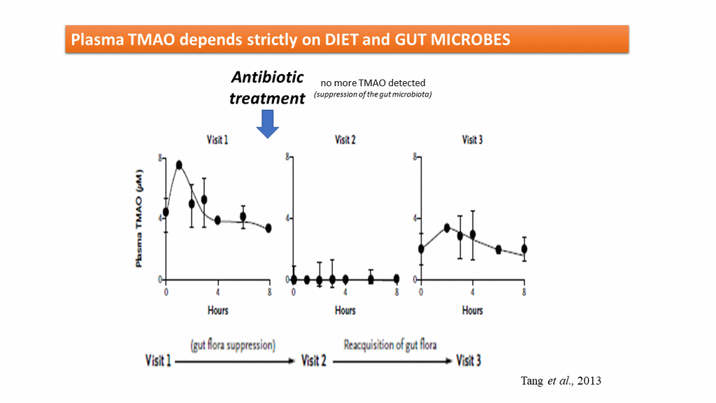 pTMAO relies only on the presence / absorption of gut TMA and next its absorption. In turn, gut TMA depends only on some dietary compounds and gut microbiota composition. Therefore pTMAO, the deleterious compound is the result of the morbid union of diet & gut microbes. As a proof, the use of antibiotics which destroyed the gut microbiota also inhibits the formation of plasma TMAO (visit 2 above) under a same diet eaten a few week before (visit 1) or after (visit 3) the antibiotic treatment (shown here in humans, experiment performed in Hazen's Lab, 2013).